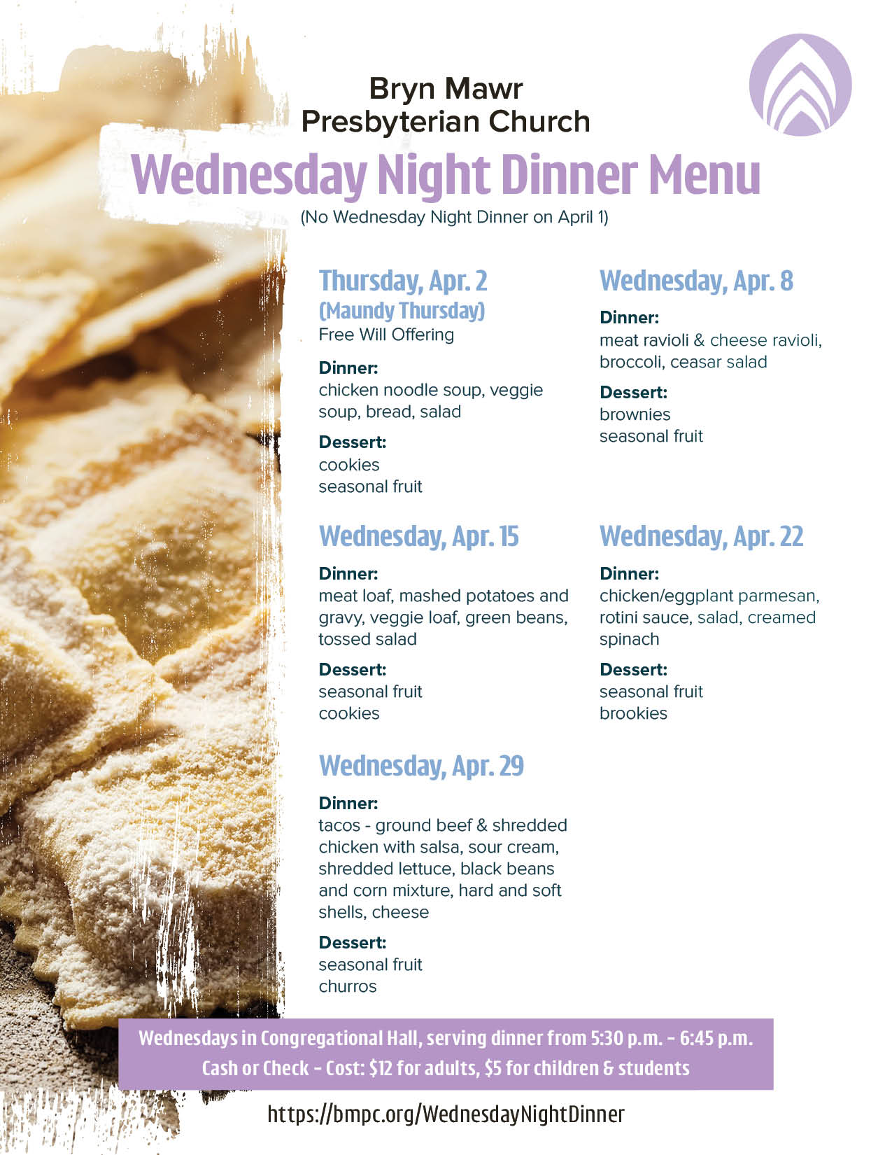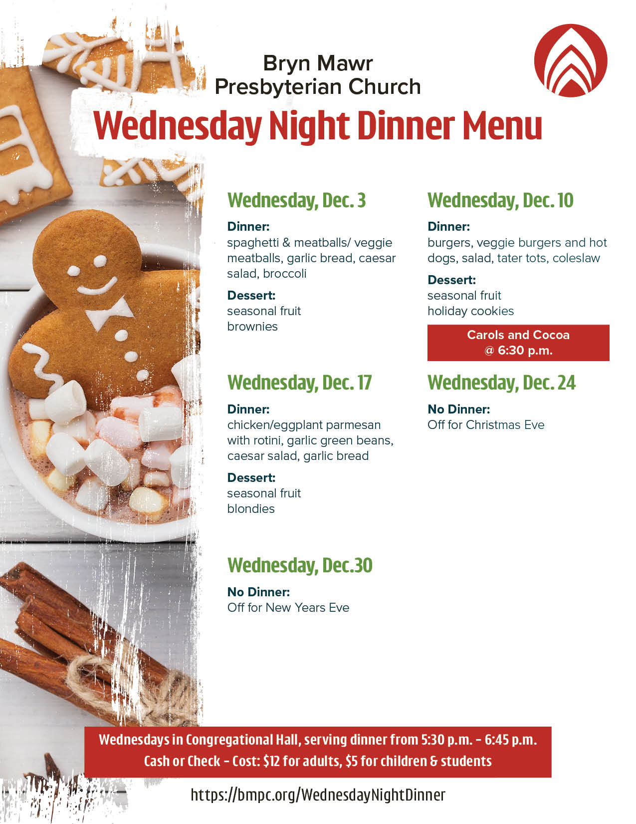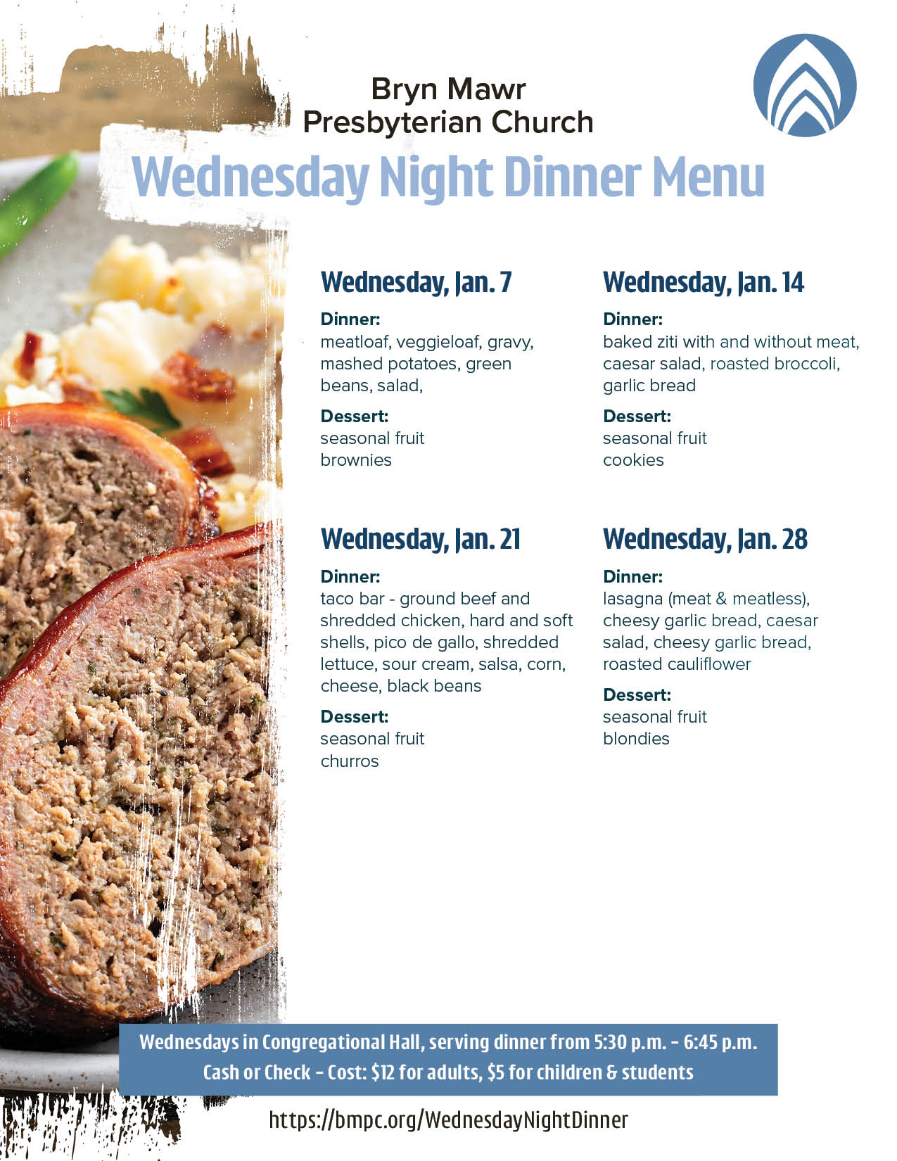 Come gather for Wednesday Night Dinner—a weekly opportunity to enjoy a warm, catered meal and connect with others in the BMPC community.